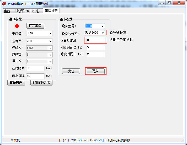 打開(kāi)采集配置軟件,選擇串口設(shè)定菜單,在通訊參數(shù)中點(diǎn)擊關(guān)閉串口,選擇相應(yīng)的串口號(hào)和波特率(默認(rèn)9600),超時(shí)時(shí)間和最小間隔都改成50ms。基本參數(shù)中設(shè)備型號(hào)選擇PT08。點(diǎn)擊打開(kāi)串口 ,點(diǎn)擊 讀取 按鈕,在下邊信息欄中顯示讀取成功,則表示聯(lián)機(jī)成功,(若顯示通信失敗,請(qǐng)確定串口接線,串口號(hào),波特率和地址是否正確)。