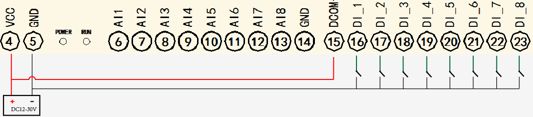 DI(開關量輸入) | 15 | DCOM+ | 開關量輸入信號正(共正,電壓范圍DC5-30V) |