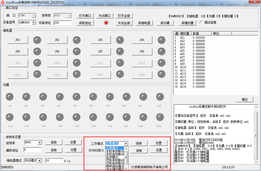 打開“聚英翱翔DAM調(diào)試軟件”點擊繼電器模式后面下拉箭頭進(jìn)行模式的選擇。(后邊時間可自行設(shè)置,實際時間=填寫數(shù)字*0.1【單位秒】)