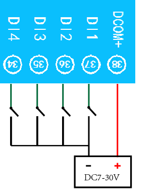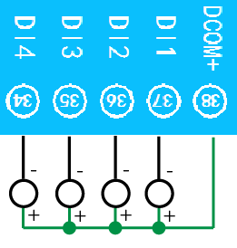 下圖中的電源部分為傳感器供電,AI1-AI8接傳感器信號(hào)正,ACOM-為傳感器信號(hào)負(fù),ACOM+不用。