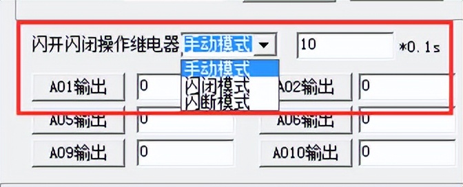 打開(kāi)“聚英翱翔DAM調(diào)試軟件”點(diǎn)擊繼電器模式后面下拉箭頭進(jìn)行模式的選擇。(后邊時(shí)間可自行設(shè)置,實(shí)際時(shí)間=填寫(xiě)數(shù)字*0.1【單位秒】)