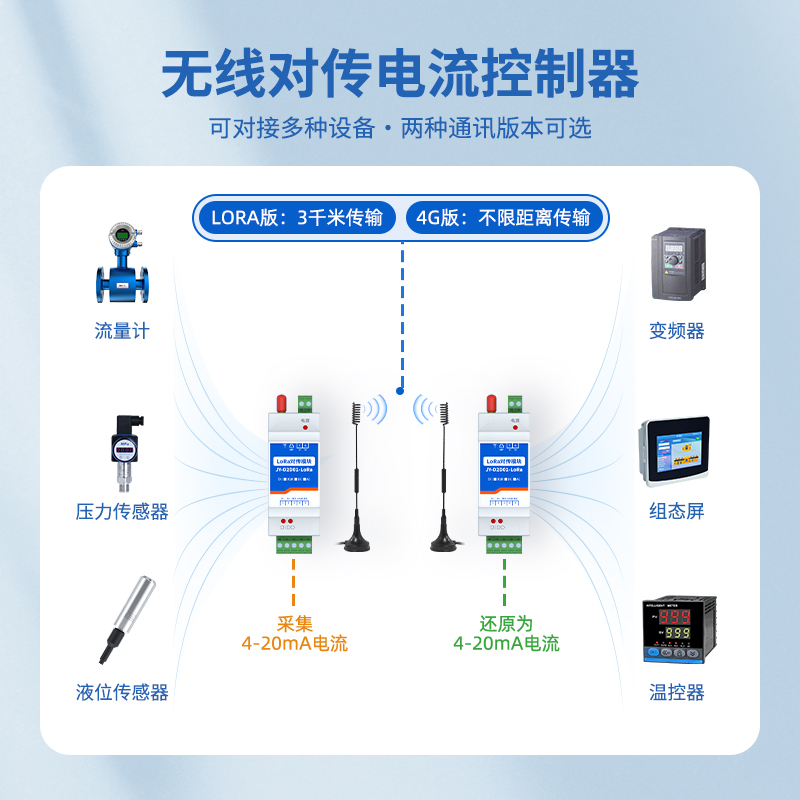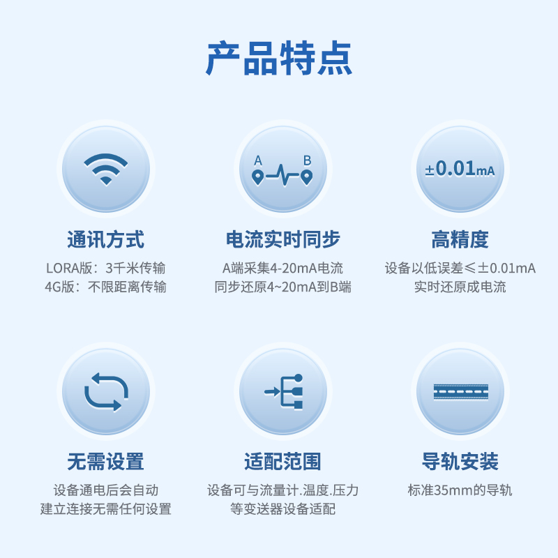 模擬量對傳模塊通過LoRa/4G技術進行通信,信號傳輸穩定可靠,不易受到外部干擾,無需設置設備通電后會自動建立連接,電流實時同步,設備可與流量計、溫度、壓力等變送器設備適配,設備精度高,誤差低于0.01mA,支持標準35mm導軌安裝。