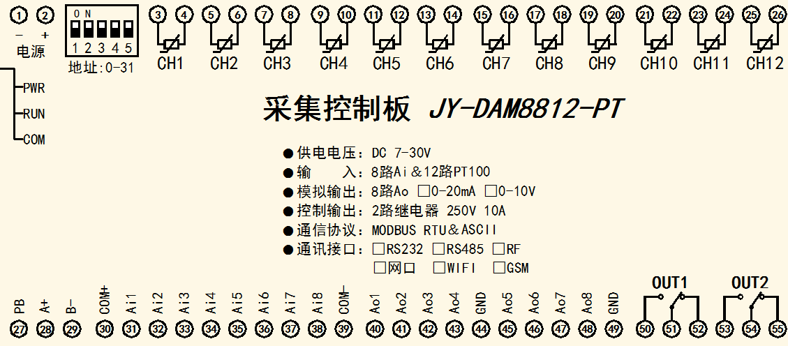 型號 | modbus | RS232 | RS485 | 模擬量 | 繼電器 | PT100 |