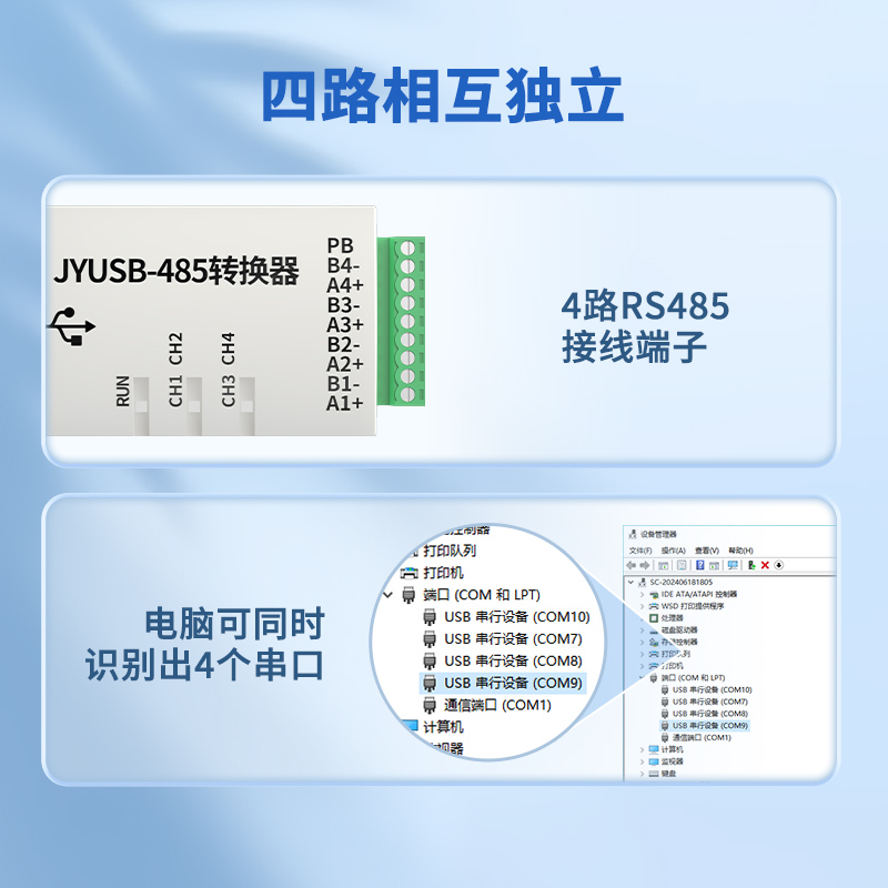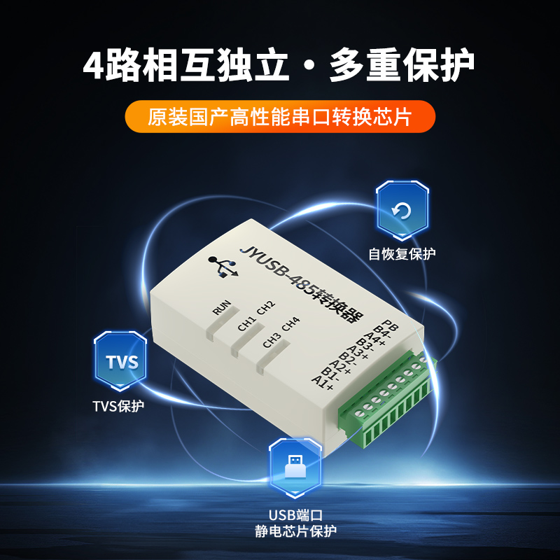 USB轉(zhuǎn)RS485轉(zhuǎn)換器,支持2/3/4路兩線式RS-485半雙工通訊轉(zhuǎn)換器,外接多個(gè)設(shè)備或遠(yuǎn)距離通信時(shí),可以在線路終端并聯(lián)一個(gè)120Q匹配電阻(1/4W),WIN10/WIN11系統(tǒng)免驅(qū)使用,即插即用,內(nèi)置高性能串口轉(zhuǎn)換芯片,最高通訊速率可達(dá)1M